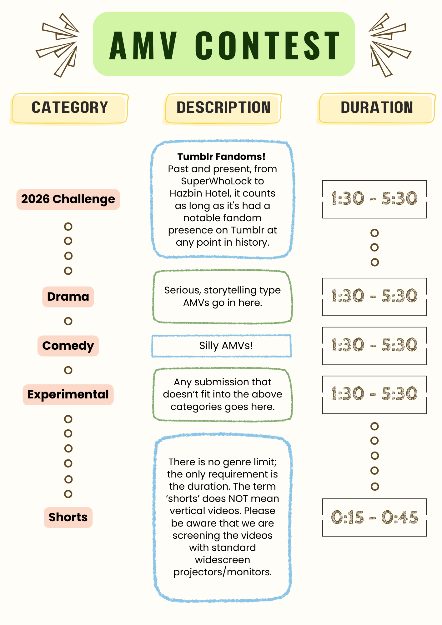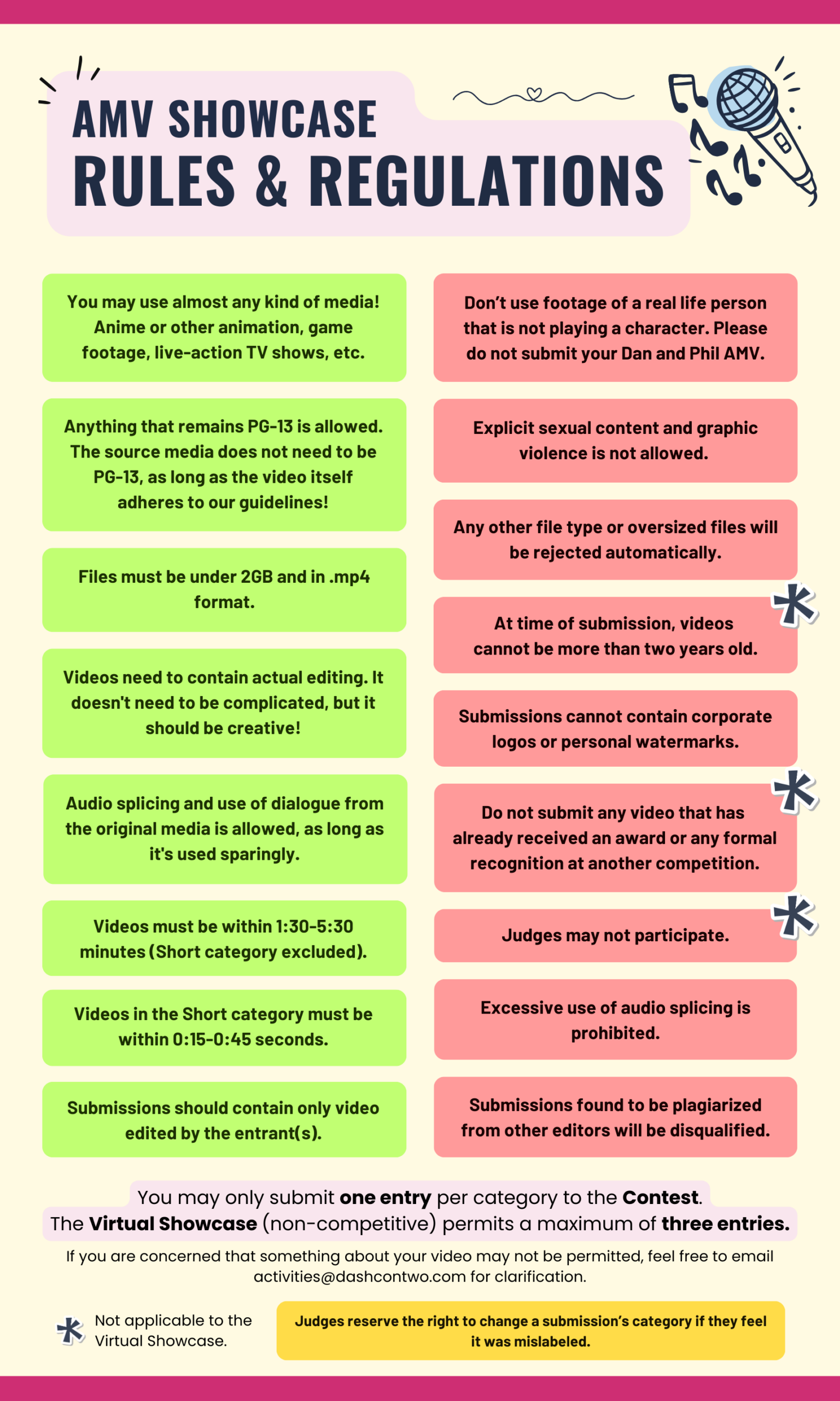 Entrants can submit a maximum of three videos to the Contest and the Virtual Showcase respectively (therefore six videos total for the entirety of the AMV Showcase). This means that entrants can’t compete in every category, and will have to choose their top three if they want to compete in multiple. Only one video may be submitted per category, meaning that the allotted three videos will need to go into separate categories. (For example, an entrant could not submit two videos to the 2026 Challenge. They would need to rescind one video, or find a different category for the second video to compete under.)
