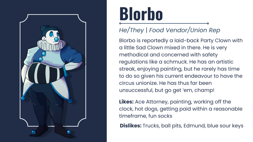 Blorbo is reportedly a laid-back Party Clown with a little Sad Clown mixed in there. He is very methodical and concerned with safety regulations like a schmuck. He has an artistic streak, enjoying painting, but he rarely has time to do so given his current endeavour to have the circus unionize. He has thus far been unsuccessful, but go get ‘em, champ!